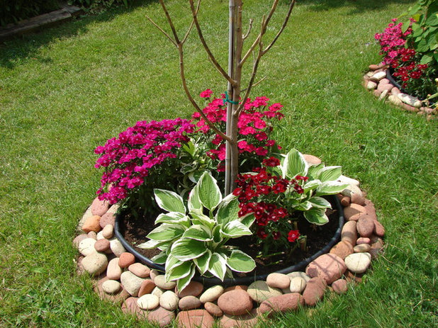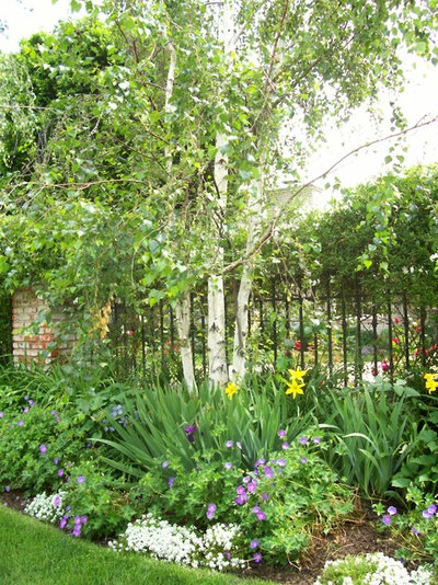 С деревьями, имеющими поверхностные корни и разреженную крону, хорошо уживается лилейник (Hemerocallis), который не переносит вымокания верхних слоев почвы. Его можно высаживать рядом с ажурными березами (как на фото), сливами и вишнями.